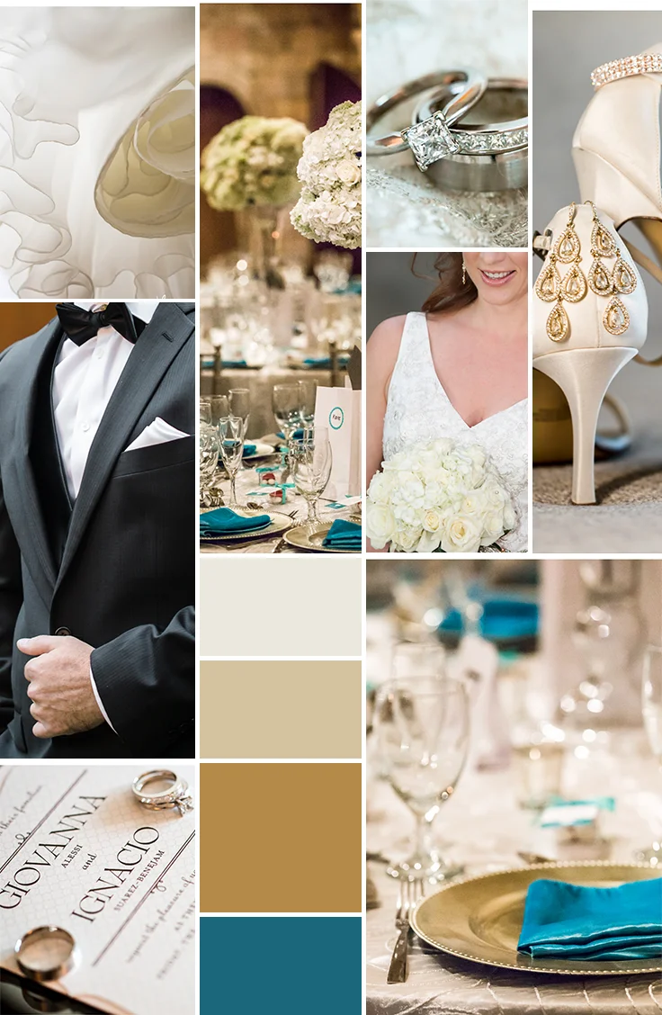 Subtle shades of gold, champagne and cream with teal accents perfectly complimented this Formal Winter Evening Wedding at the Ancient Spanish Monastery in Miami, Florida. The bride wore a floor length lace and satin gown with diamond and gold accent jewelry. The groom wore a traditional black bow tie tuxedo with a perfectly creased handkerchief. The tables were dressed with champagne linens, soft petal cream rose and hydrangea centerpieces, antiqued gold chargers and votives, fine stemware, and finished with rich teal silk napkins. A perfect little box of white Jordan almonds awaited each guests' setting.